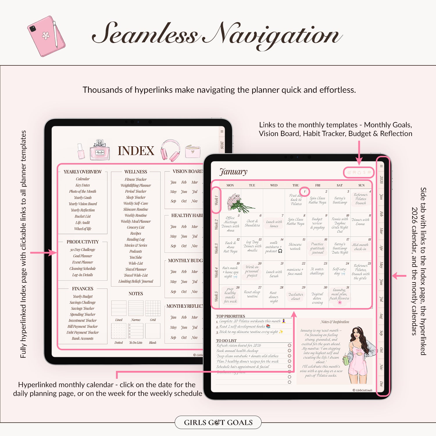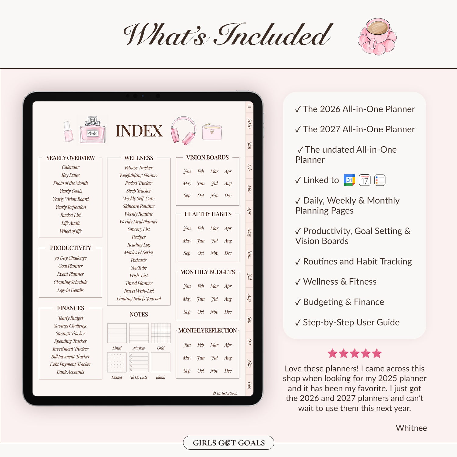 This 2026 + 2027 + Undated Digital Planner Bundle is your ultimate all-in-one tool for creating the life you love for years to come. Designed for women who want to stay organized, prioritize wellness, and look after every aspect of their growth, this hyperlinked planner takes you from goal-setting to daily planning, with space for self-care, finances, meal planning, and more.