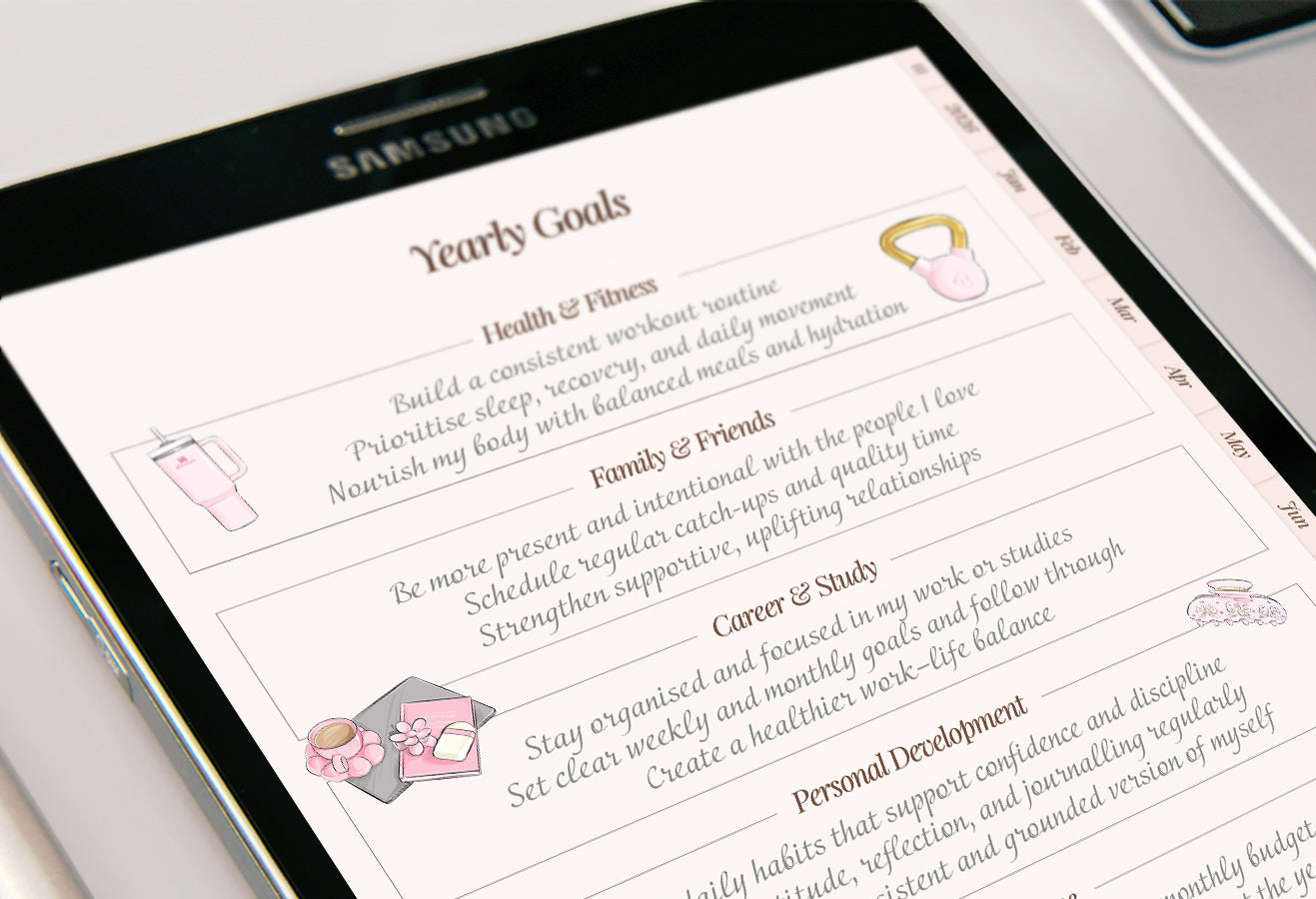 You will need a PDF annotation app to use the planner effectively. Many of these apps are either free or available for a one-time fee. Popular apps include GoodNotes (iOS), Notability (iOS), Noteshelf (iOS and Android) and Samsung Notes (Android) among others.