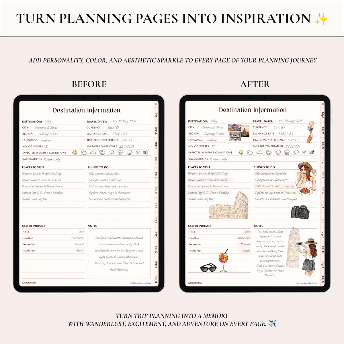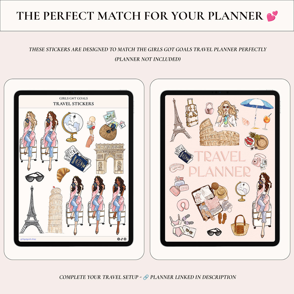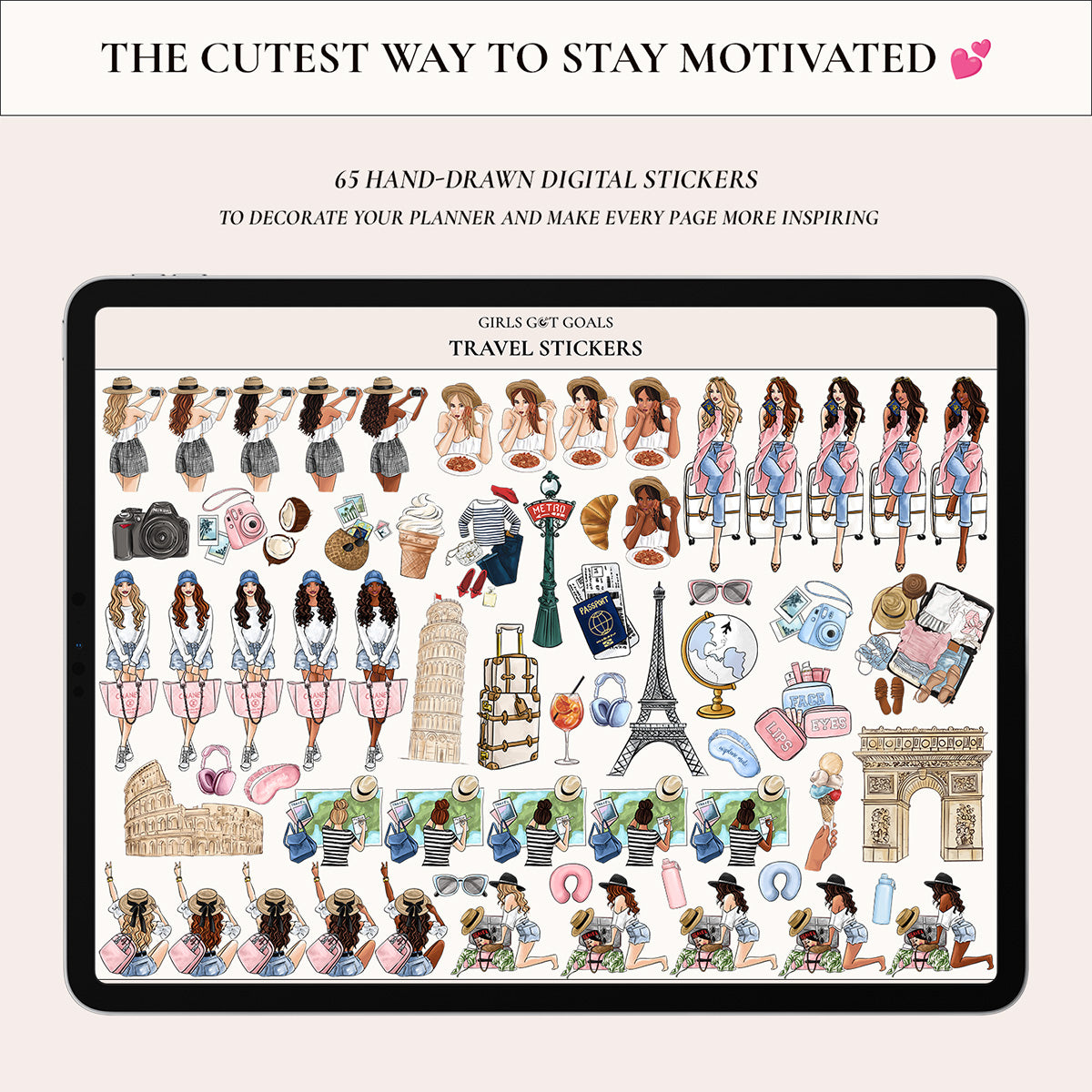 Perfect for decorating your Girls Got Goals Travel Planner or any digital journal, these stickers add a touch of beauty and adventure to every page — helping you romanticize the entire travel planning process, from dreaming to doing.