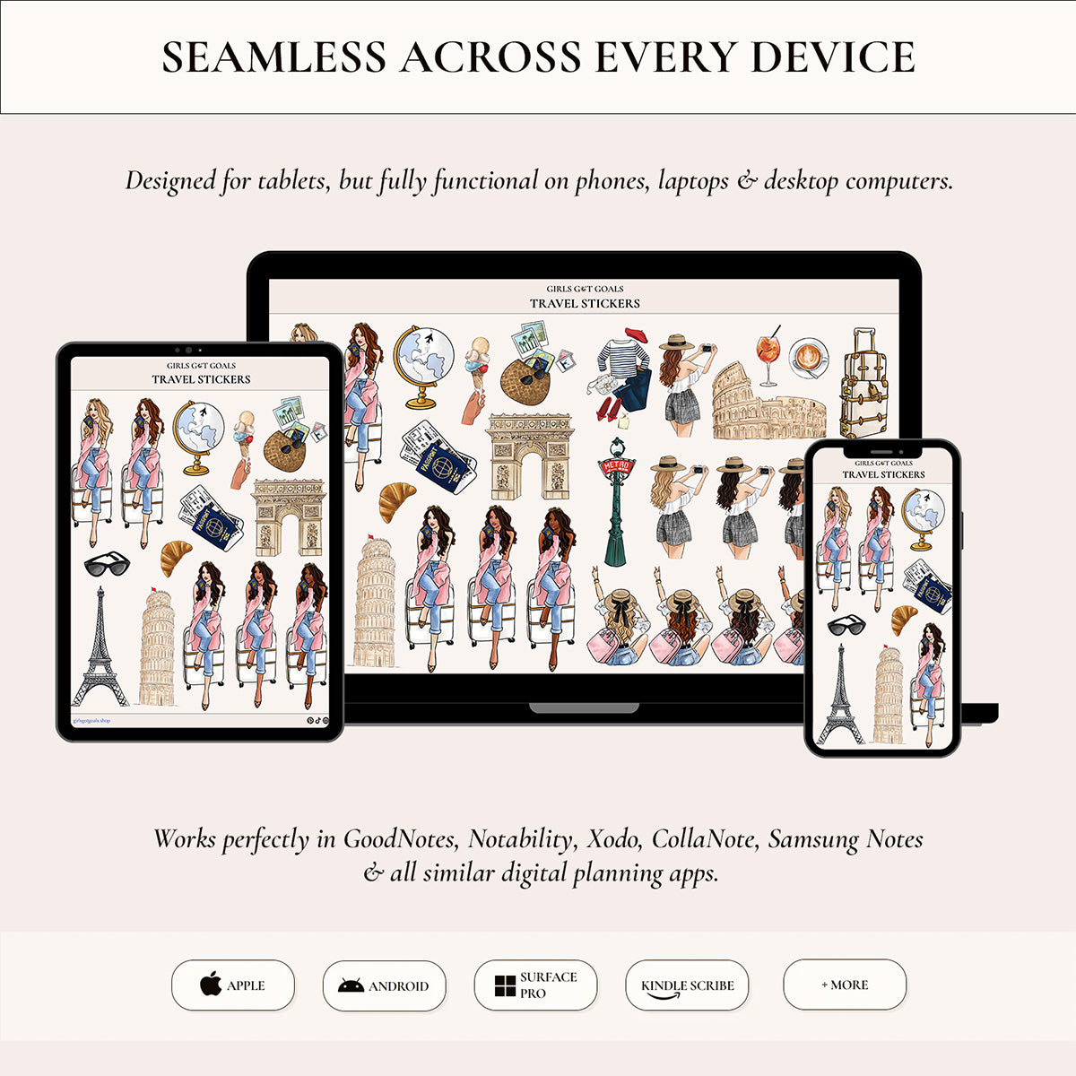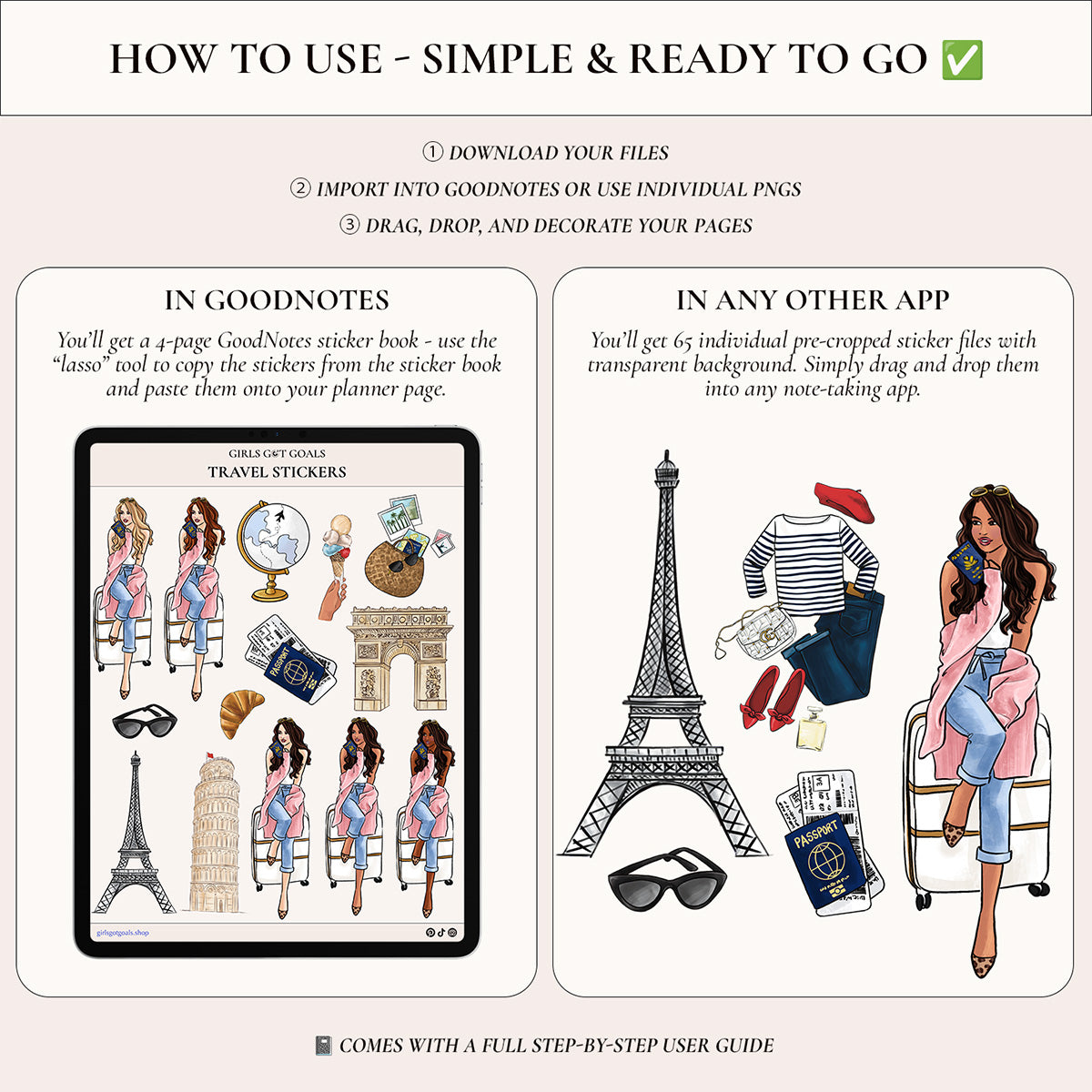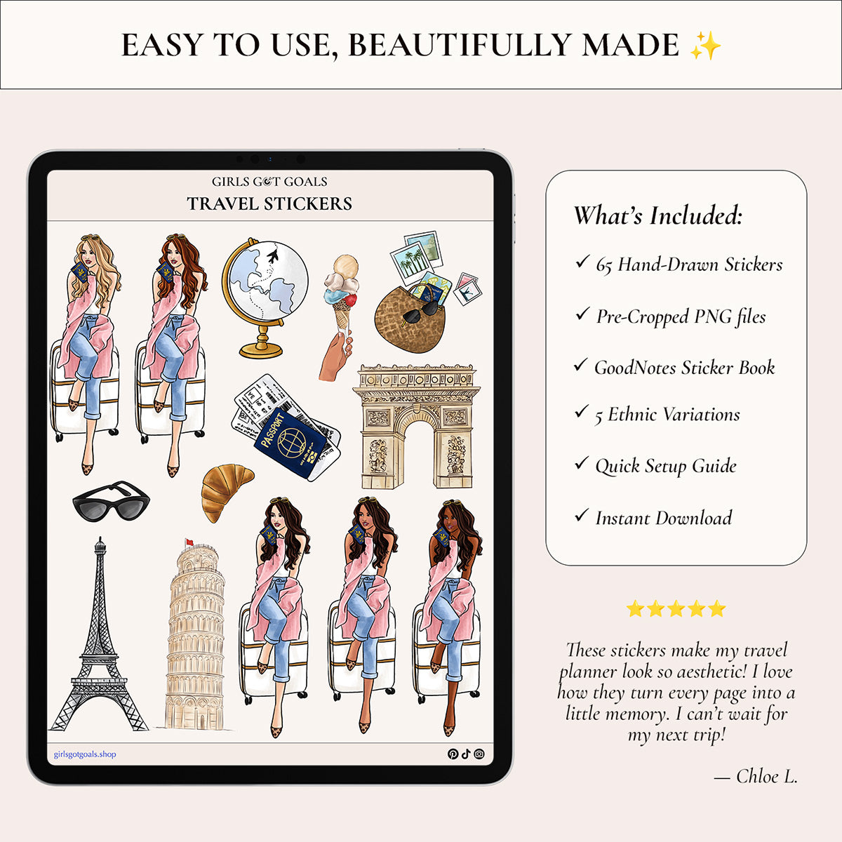 Perfect for decorating your Girls Got Goals Travel Planner or any digital journal, these stickers add a touch of beauty and adventure to every page — helping you romanticize the entire travel planning process, from dreaming to doing.